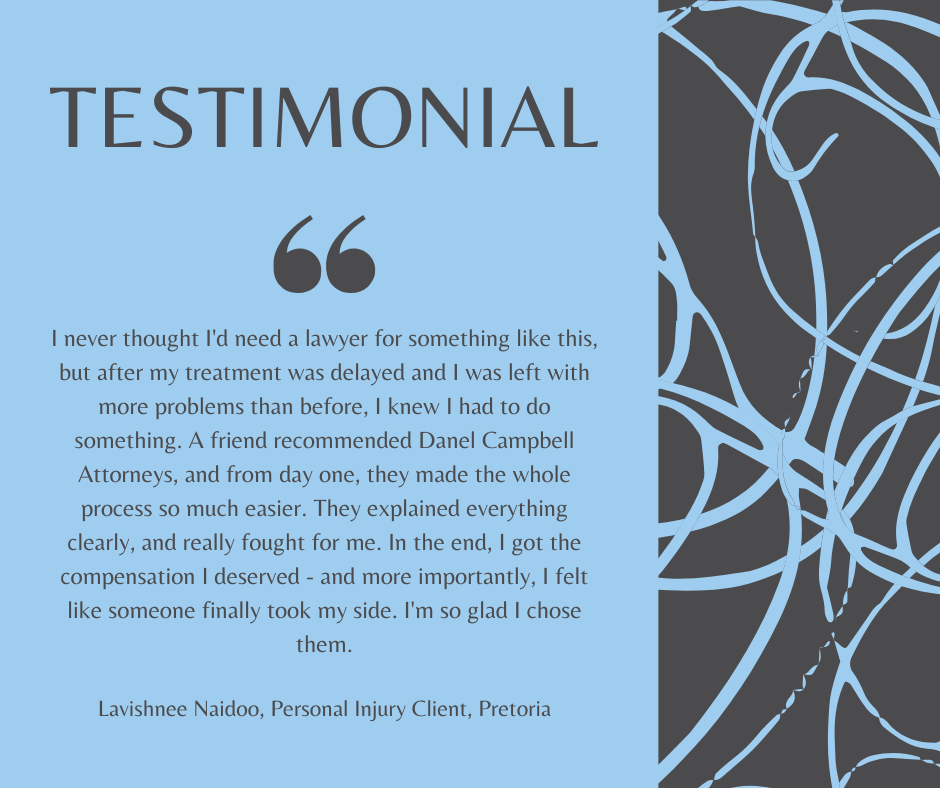 If you’ve been injured in an accident, the impact can be overwhelming — physically, emotionally, and financially. At Danel Campbell Attorneys, with over 8 years’ experience, we help clients pursue compensation with compassion and determination. Whether your matter involves a slip and fall, medical negligence, or a Road Accident Fund claim, we guide you through every step of the process with clarity and care.
